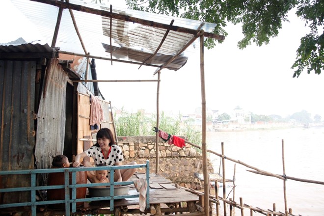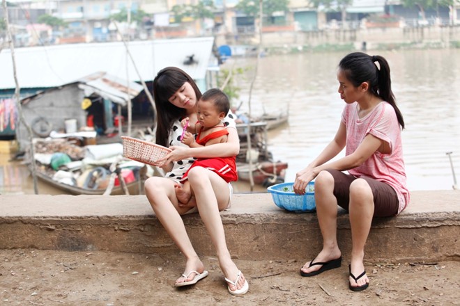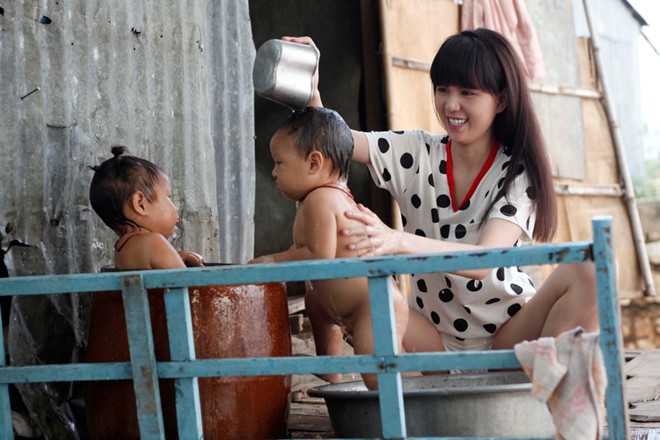 Trong phim, có cảnh Ngọc Trinh tắm cho 2 nhóc tì. Sinh trưởng ở vùng quê nên người đẹp không nề hà việc chăm sóc trẻ nhỏ. |