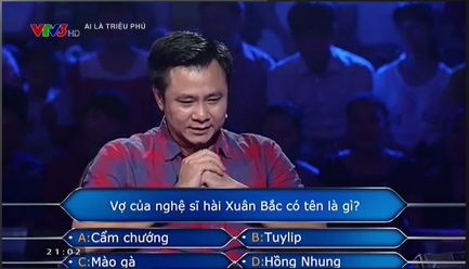 Tới phần thi của nghệ sĩ Tự Long, chương trình lại tiếp tục đưa ra những đáp án có phần khá "kỳ lạ" với câu hỏi "Vợ của nghệ sĩ hài Xuân Bắc có tên là gì?” với 4 đáp án là: A. Cẩm chướng; B.Tuylip; C. Mào Gà; D. Hồng Nhung.