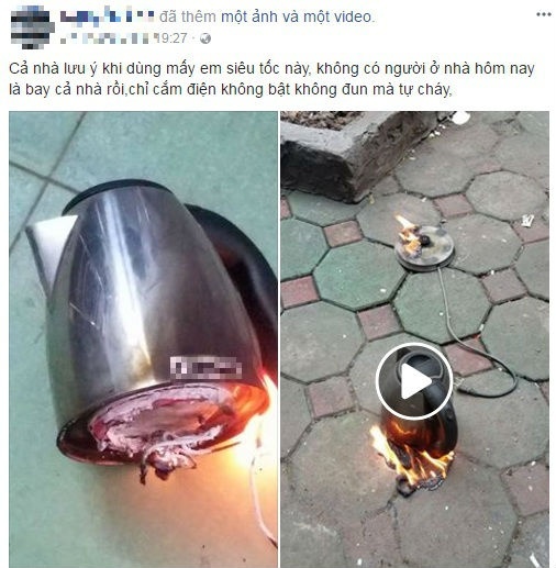 Tải khoản Facebook N.A chia sẻ: “Cả nhà lưu ý khi dùng mấy em siêu tốc này. Không có người ở nhà hôm nay là bay cả nhà rồi. Ấm chỉ cắm điện không bật, không đun mà tự cháy”.