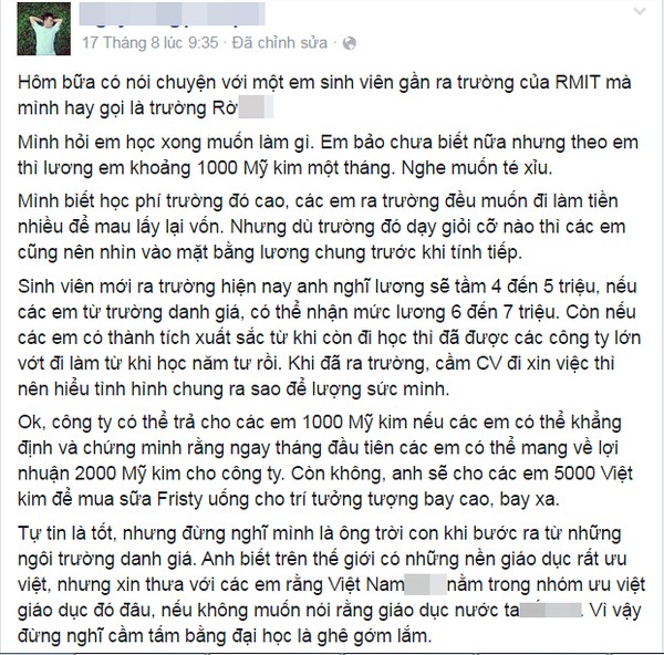 Cư dân mạng đã phản ứng dữ dội trước quan điểm của một nhà văn trẻ khá nổi tiếng, khi anh này bày tỏ sự bức xúc muốn bạt tai sinh viên RMIT vì người sinh viên này mong lương nghìn đô sau khi ra trường.