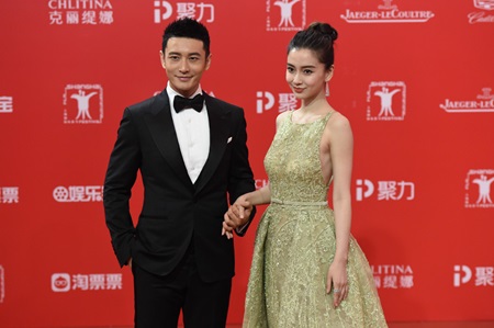 Vợ chồng Huỳnh Hiểu Minh – Angela baby nắm chặt tay tình cảm. Angelababy vẫn xinh đẹp như thường lệ với bộ váy công chúa đính kim sa quý phái.