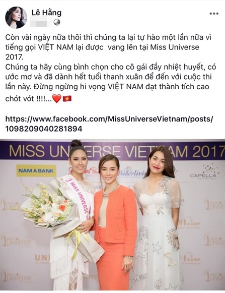 Nhiều người đẹp Việt đã dành những lời động viên tích cực cho đại diện Việt Nam – Á hậu Nguyễn Thị Loan trước thềm Chung kết Miss Universe 2017.