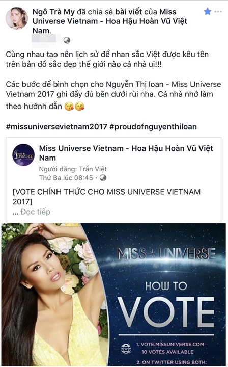 Các thí sinh của cuộc thi Hoa hậu Hoàn vũ Việt Nam năm nay như Hoàng Thùy, Mâu Thủy, Cẩm Tiên,… cũng dành những lời chúc tốt đẹp cho Á hậu Nguyễn Thị Loan và kêu gọi mọi người cùng bình chọn cho đại diện Việt Nam tại đấu trường sắc đẹp lớn nhất hành tinh này.