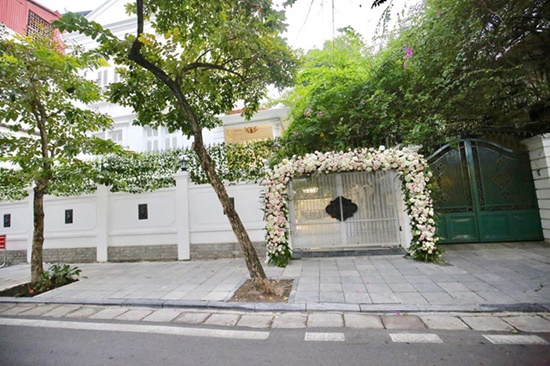 | Từ sáng sớm, ở phía nhà trai, cổng hoa và không gian bên trong đều được trang trí tông màu trắng chủ đạo. |