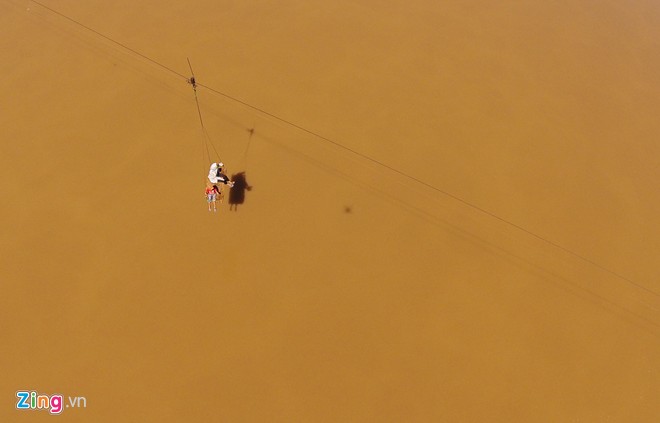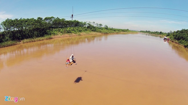 Có những lần nước dâng cao, cáp treo người dân đi sát mặt nước. "Con sông này vốn rất sâu, có đoạn lên tới 5 m. Tuy nhiên vì mưu sinh nên chúng tôi vẫn phải sử dụng nó như một phương tiện đi lại hàng ngày", chị Hải tâm sự. |