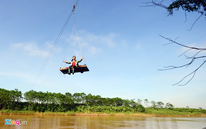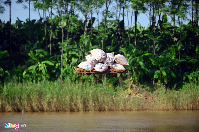 Được làm từ động cơ xe máy, vận tốc 20km/h, hệ thống cáp treo của một số người dân thôn Mai Châu (xã Đại Mạch, Đông Anh) ngày ngày cõng hàng trăm kg hàng hóa và người qua sông.
