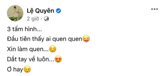 Trước đó ngày 5/4, Lệ Quyên tiếp tục chiêu đãi dân tình bằng màn "cẩu lương" chất lượng. Lần này, "nữ hoàng phòng trà" tiết lộ ba bước "cưa đổ" trai đẹp khiến nhiều người không khỏi thích thú. Tưởng chừng không dễ mà lại dễ không tưởng, Lệ Quyên tiết lộ: "Đầu tiên thấy ai quen quen - Xin làm quen - Dắt tay ra về".