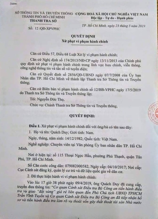 Thông tin trên báo Tuổi Trẻ, sáng 24/5, ông Nguyễn Đức Thọ, chánh thanh tra Sở Thông tin và truyền thông TP.HCM, xác nhận Thanh tra Sở Thông tin và truyền thông TP.HCM vừa có quyết định xử phạt hành chính đối với ông Quách Duy, sinh năm 1982, hiện là chuyên viên văn phòng UBND TP.HCM.