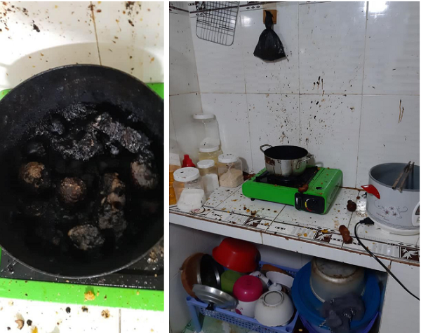 Chưa hết, nước kho thịt cháy đen còn bắn đầy lên tường và sàn bếp.