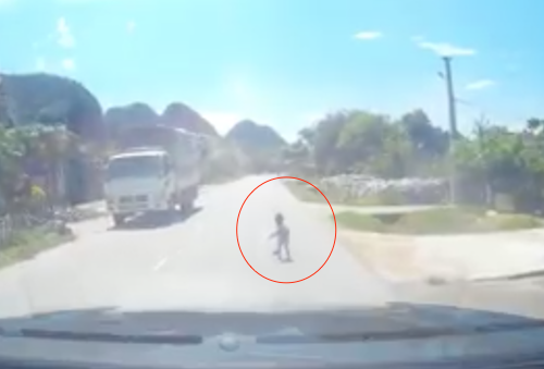 Hình ảnh cháu bé đang chập chững trên quốc lộ. Ảnh cắt từ clip. |