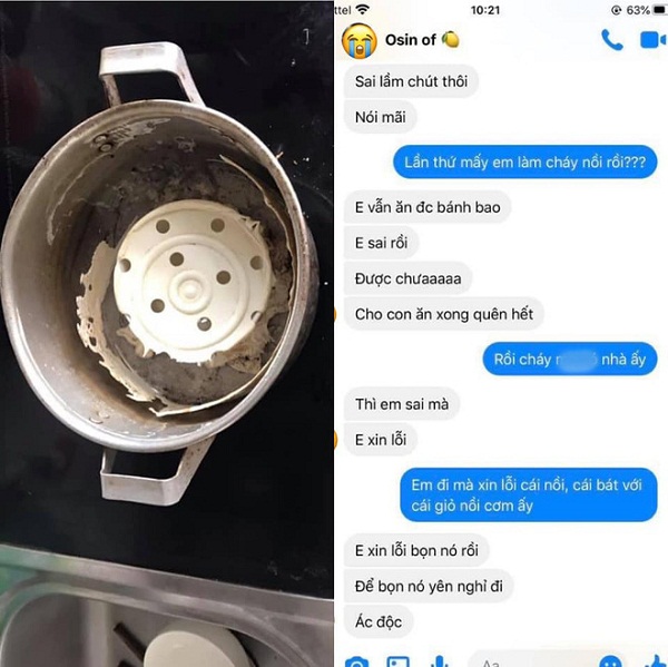 Theo đó, khi hấp bánh bao, cô để quên luôn trên bếp khiến nồi cạn nước, xửng hấp bị nóng chảy luôn. Tỉnh dậy vì ngửi thấy mùi khét rồi chạy xuống bếp thấy ngay "thảm họa" như thế thì ông chồng sợ hãi cũng phải.