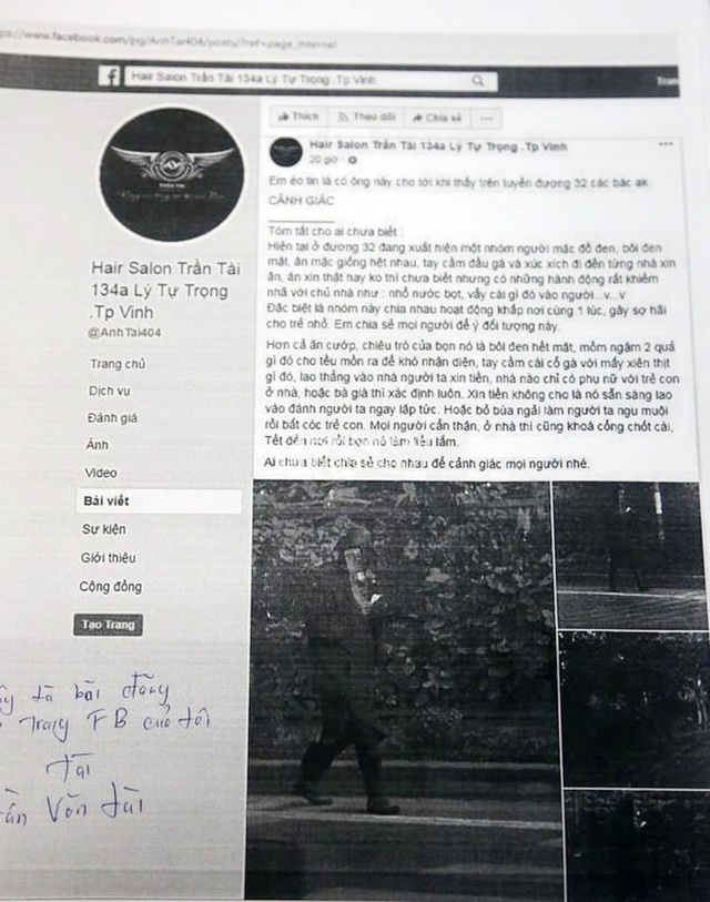 Được biết, trước đó, ngày 3/12, Trần Văn Tài đọc được thông tin trên Facebook về một nhóm đối tượng mặt đen kỳ bí, có nhiều hành động đáng ngờ tại Hà Nội. Ngay sau đó, Tài đã copy nội dung, hình ảnh, video trên mạng xã hội, rồi chỉnh sửa và thêm vào nội dung khẳng định rằng Tài đã nhìn thấy đối tượng “kỳ bí” này trên tuyến đường 3-2 (tức Đại lộ Lênin, TP Vinh), sau đó đăng tải lên trang Facebook “Hair Salon Trần Tài 134a Lý Tự Trọng TP Vinh”.