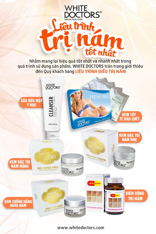 * Ban đêm bôi kem trị nám nặng Melasma Pro - White Doctors lên vùng da bị nám tàn nhang để xóa sạch nám tàn nhang, đốm nâu, đồi mồi. Thoa kem chữa nám nhẹ Melasma Clearr - White Doctors lên vùng da xung quanh để làm đều màu da và làm sáng da