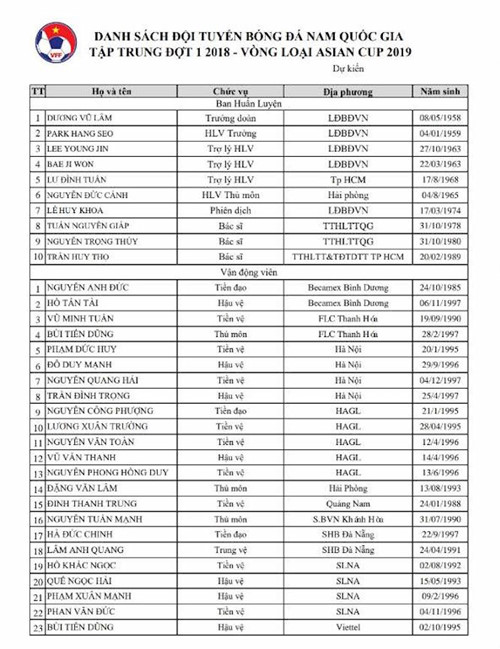 Để chuẩn bị cho Asian Cup 2019 sắp tới, HLV Park Hang-seo đã triệu tập 23 cầu thủ lên tuyển trong đó nòng cốt là lứa U23 với 14 cầu thủ.