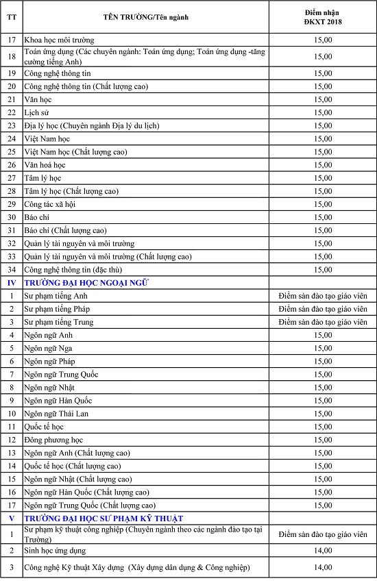 Năm nay, các trường thành viên thuộc ĐH Đà Nẵng xác định mức điểm sàn thấp nhất là 14. Nhiều ngành có mức điểm sàn là 15, 16 và cao nhất là ngành Y khoa (Khoa Y dược) là 19.