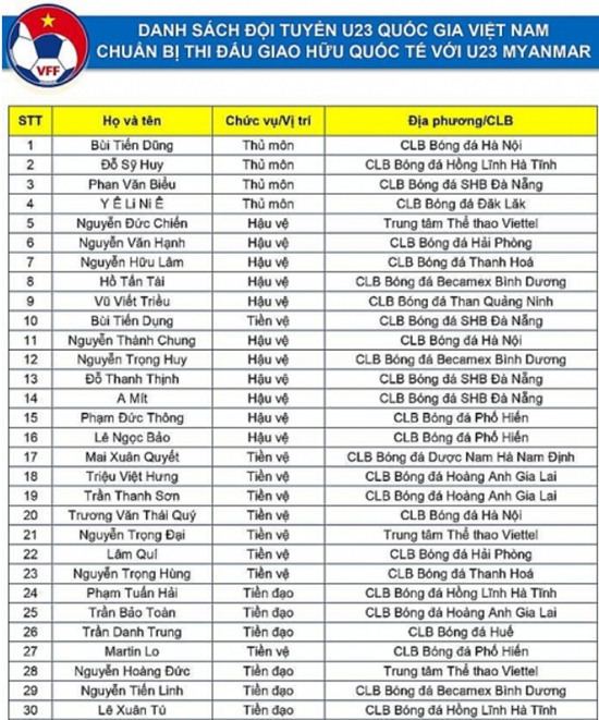 Liên đoàn Bóng đá Việt Nam (VFF) vừa công bố danh sách triệu tập 30 cầu thủ của tuyển U23 Việt Nam.