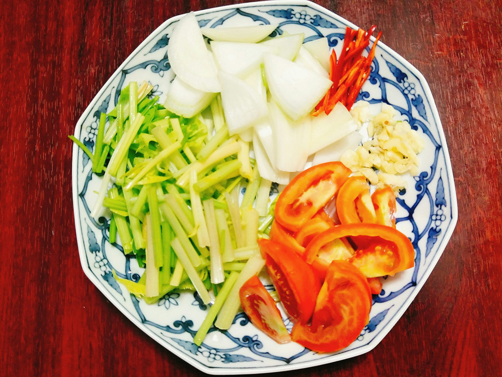 - Cần tây nhặt bỏ bớt lá, hành tây thái múi cau, ớt sừng thái sợi, tỏi băm nhỏ, cà chua rửa sạch cắt bỏ núm rồi thái múi cau.