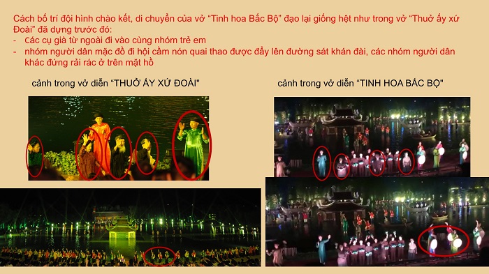 Tôi đồng ý với ý kiến này, nhà thuỷ đình nổi lên mặt nước, là chi tiết hết sức ấn tượng; là xương sống để từ đó triển khai ra các nội dung liên quan đến văn hoá Bắc Bộ nói chung và Xứ Đoài nói riêng. Phần xuất hiện của nhà thuỷ đình quá ấn tượng với những khán giả có cơ hội thưởng thức vở diễn này. Trong nghề chúng tôi, những chi tiết khiến khán giả ấn tượng và nhớ về show diễn nhất thì đó là yếu tố then chốt của vở diễn, vì vậy dân trong nghề sẽ không tái sử dụng các điểm nhấn này của một đạo diễn khác.