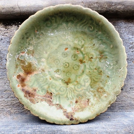 Chiếc đĩa gốm men ngọc có hoa văn trang trí hình hoa sen ở lòng đĩa và phía ngoài là hình cánh sen cách điệu (Ảnh: báo Đại đoàn kết) |