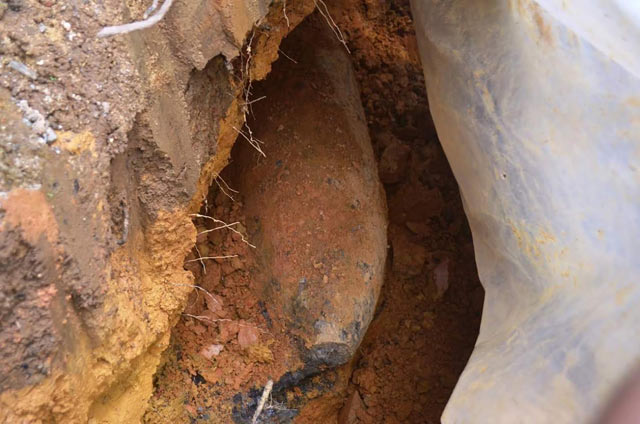 Theo đó, trong lúc đào móng làm nhà, chiếc máy múc đã múc phải quả bom, làm bị vỡ một miếng nhỏ, nhưng rất may quả bom không phát nổ.