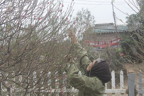 | Do đào nở sớm nên một số chủ vườn đã phải thuê người tuốt bớt hoa để dảm bảo đào nở lâu |