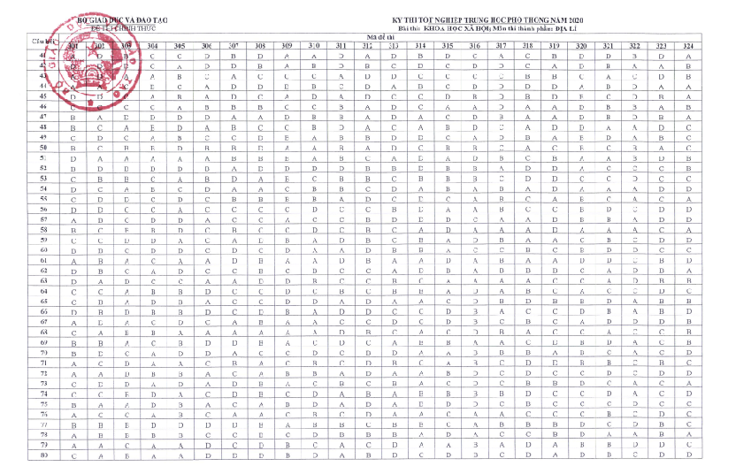 Đáp án chính thức môn Địa lý tốt nghiệp THPT 2020 của bộ GD&ĐT. |