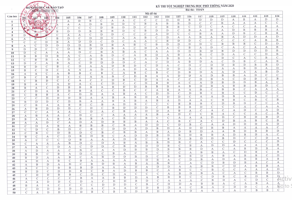 Đáp án chính thức môn Toán 24 mã đề của bộ GD&ĐT. Cập nhật đáp án chính thức môn Toán tất cả các mã đề tốt nghiệp THPT 2020 của bộ GD&ĐT nhanh nhất.