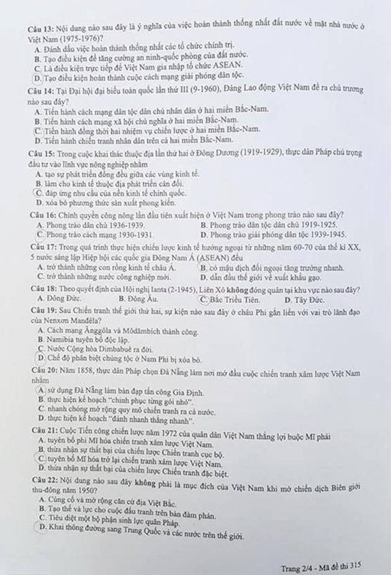 - Gợi ý đáp án môn Lịch sử - mã đề 315