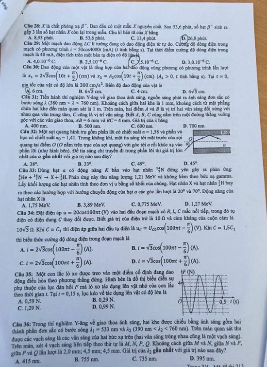 Đề thi chính thức môn Vật lý mã đề 213 kỳ thi THPT quốc gia 2019. Ảnh: VOV |