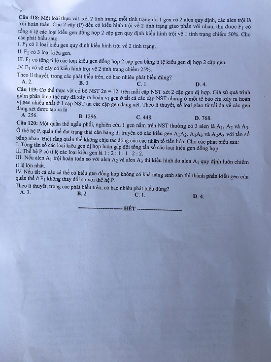 Đề thi môn Sinh học THPT quốc gia 2019 mã đề 214 (Đáp án trên đề là của thí sinh dự thi):