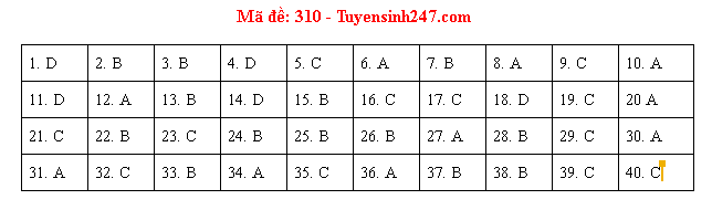 Đáp án tham khảo đề thi môn Lịch sử mã đề 310. |