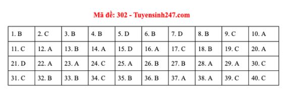 Đáp án môn Lịch sử mã đề 302.