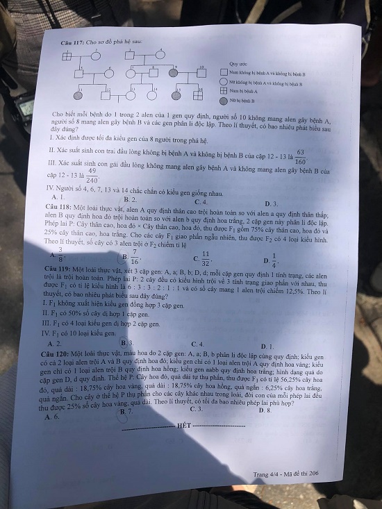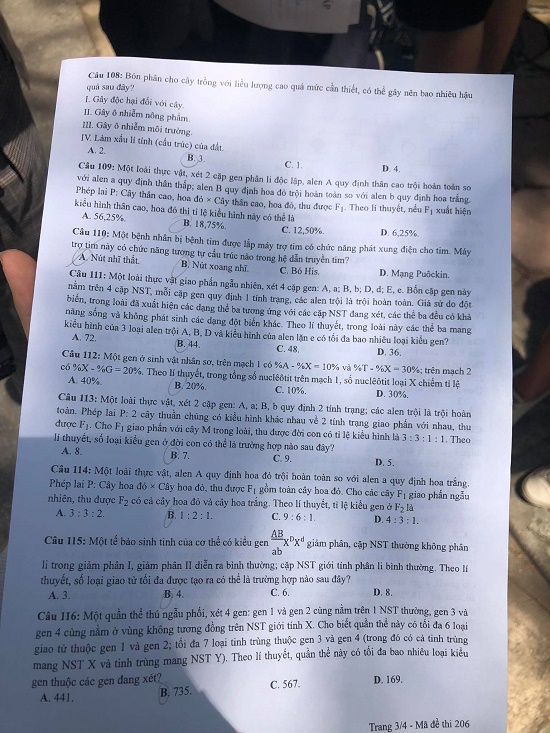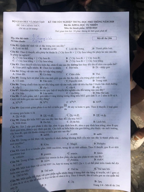 (Ấn F5 để cập nhật đáp án gợi ý môn Sinh học mã đề 206 tốt nghiệp THPT 2020)