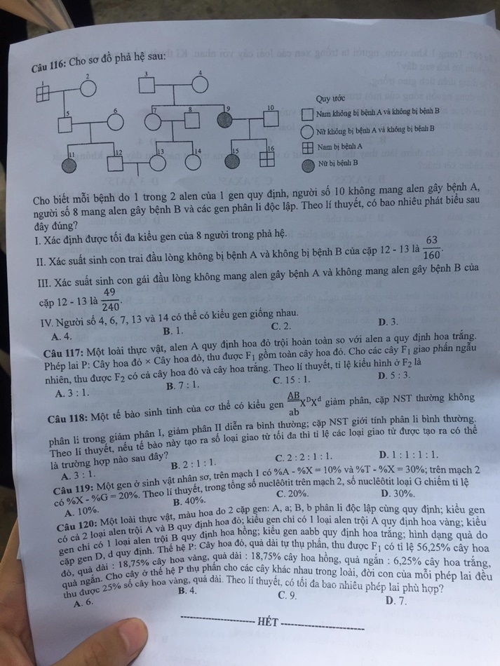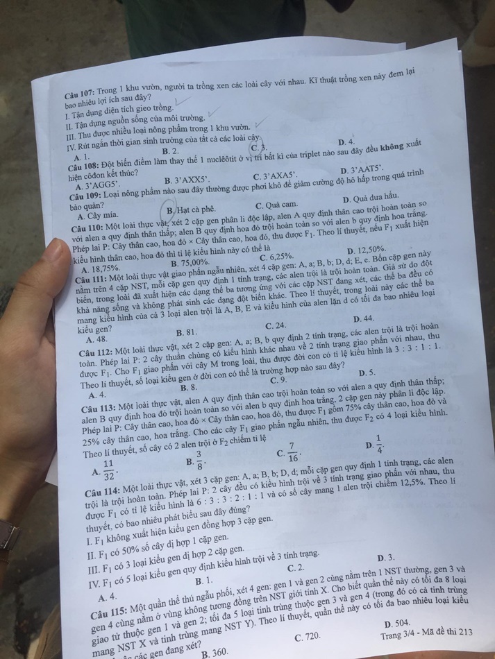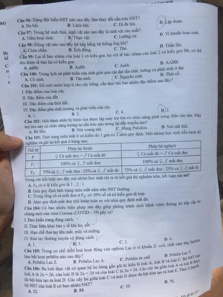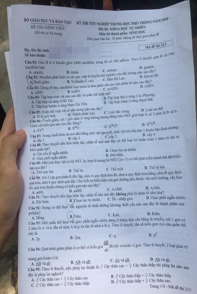 (Ấn F5 để cập nhật đáp án gợi ý môn Sinh học mã đề 213 tốt nghiệp THPT 2020)