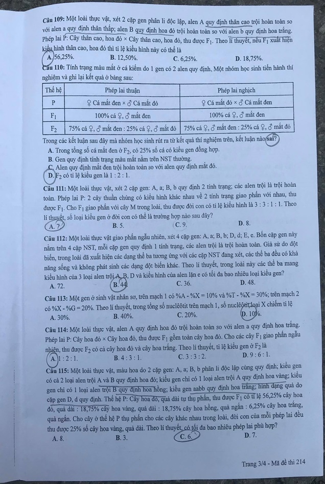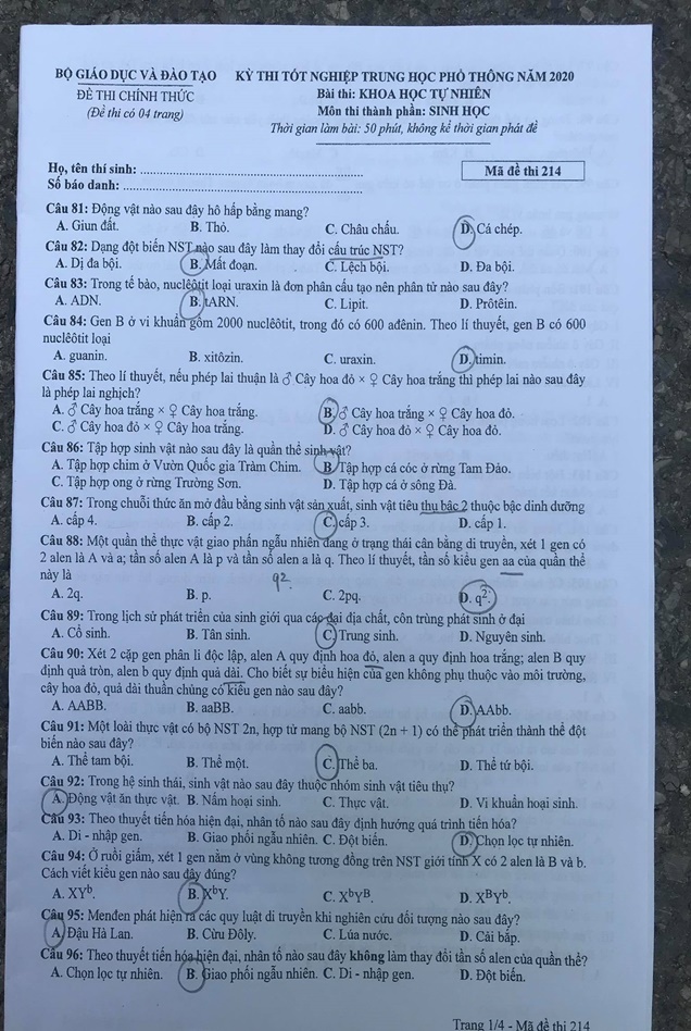 (Ấn F5 để cập nhật đáp án gợi ý môn Sinh học mã đề 214 tốt nghiệp THPT 2020)