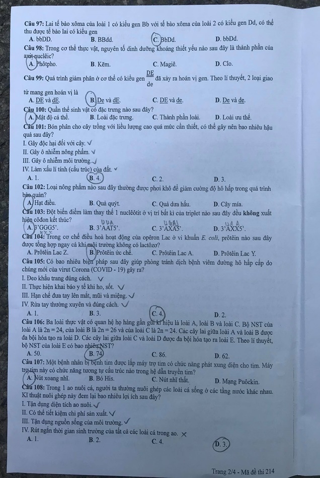 Đáp án gợi ý, đề thi môn Sinh học mã đề 214 tốt nghiệp THPT 2020 chính xác nhất. Cập nhật đáp án gợi ý môn Sinh học mã đề 214 tốt nghiệp THPT 2020 nhanh nhất, chi tiết nhất.