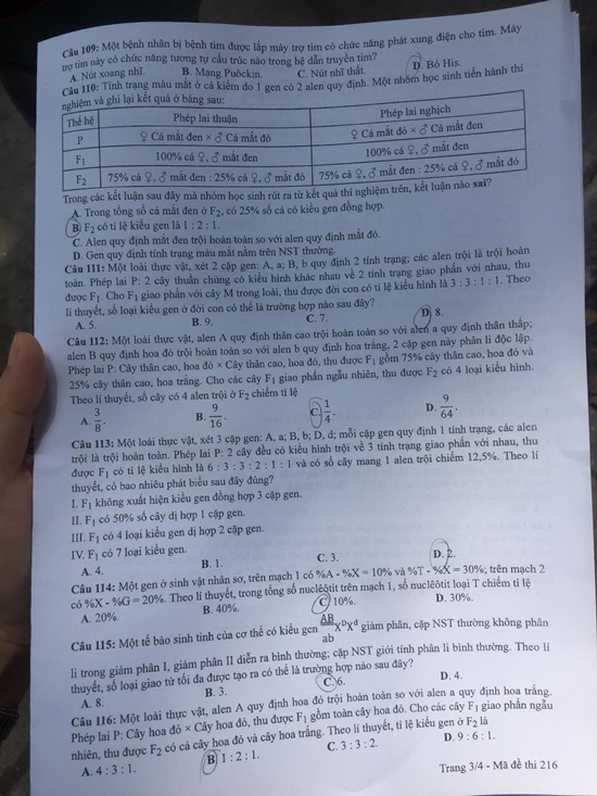 (Ấn F5 để cập nhật đáp án gợi ý môn Sinh học mã đề 216 tốt nghiệp THPT 2020)