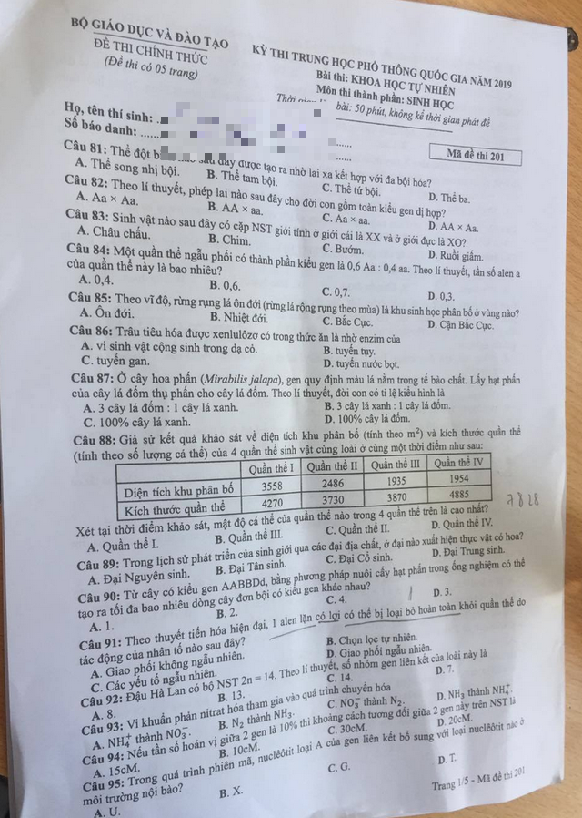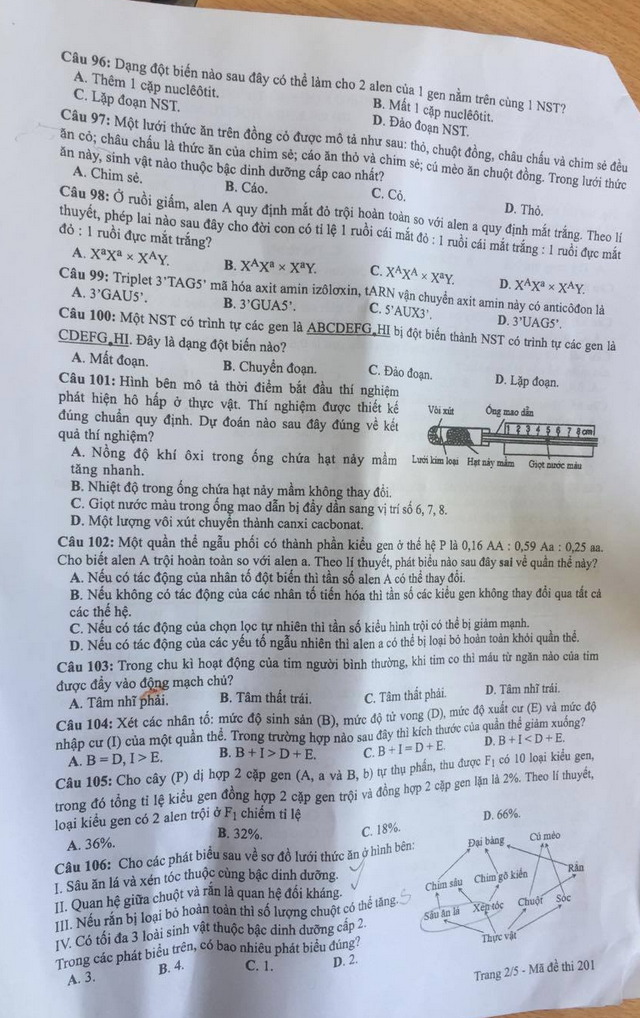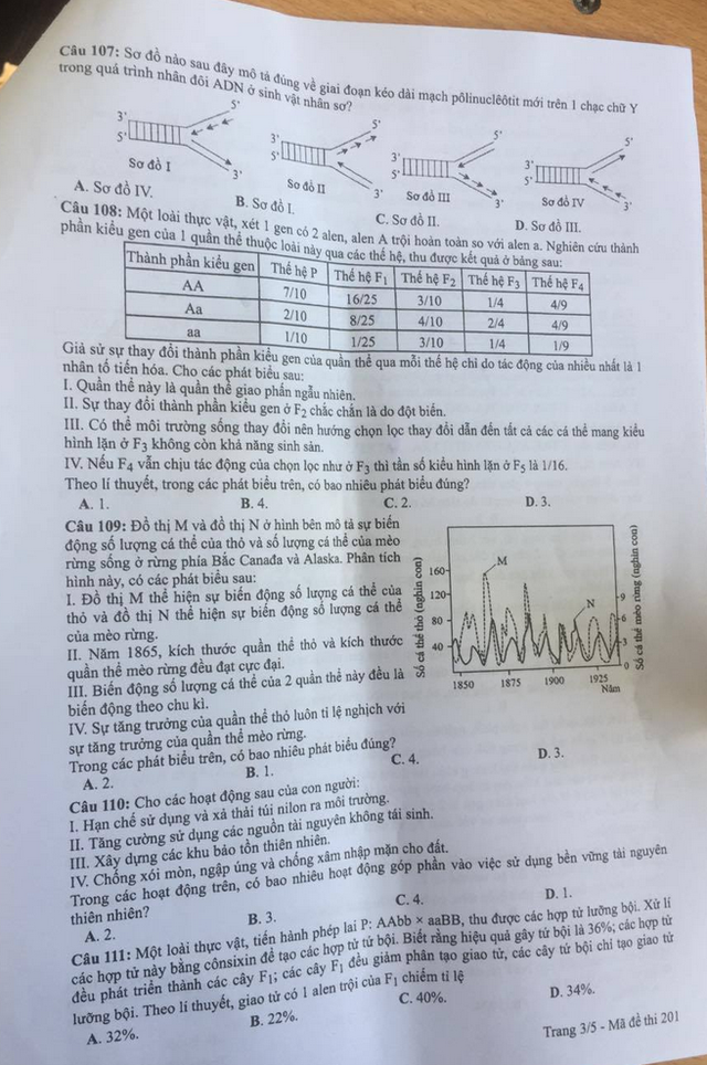 Tham khảo đáp án, đề thi môn Sinh học mã đề 201 THPT quốc gia 2019: