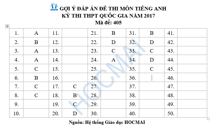(Ấn F5 để cập nhật đáp án gợi ý môn Tiếng Anh THPT quốc gia năm 2017)