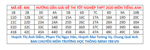 (Ấn F5 để cập nhật đáp án gợi ý môn tiếng Anh mã đề 406 tốt nghiệp THPT 2020 chuẩn nhất, chính xác nhất)