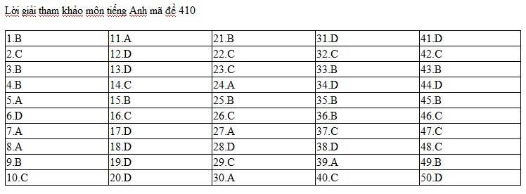 Đáp án đề thi môn Tiếng Anh mã đề 410. Cập nhật đáp án gợi ý môn Tiếng Anh THPT quốc gia năm 2017 trên trang Đời sống & Pháp luật trong khi chờ đáp án chính thức của Bộ GD-ĐT.