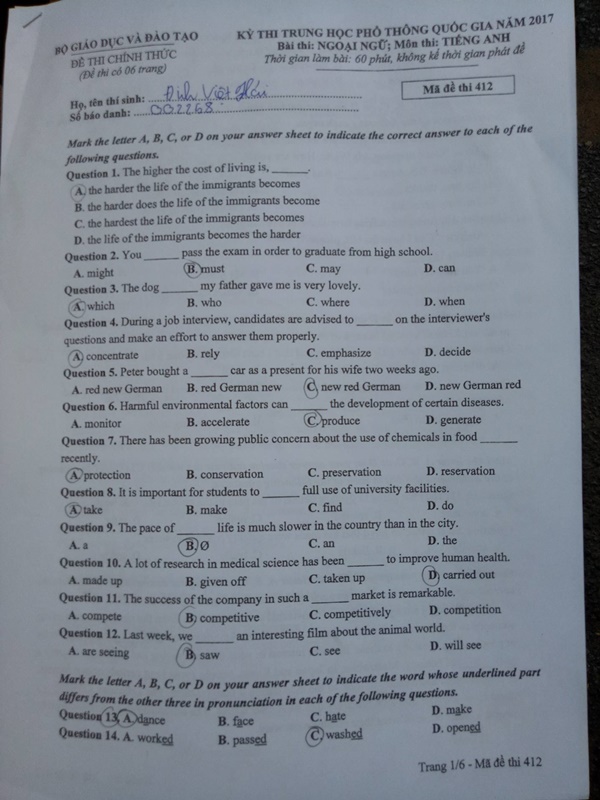Đáp án đề thi môn Tiếng Anh mã đề 412. Cập nhật đáp án gợi ý môn Tiếng Anh THPT quốc gia năm 2017 trên trang Đời sống & Pháp luật trong khi chờ đáp án chính thức của Bộ GD-ĐT.