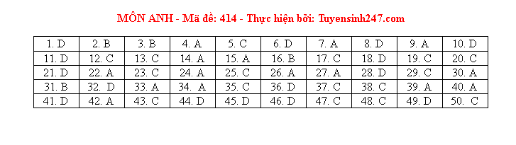 (Ấn F5 để cập nhật đáp án gợi ý môn tiếng Anh mã đề 414 tốt nghiệp THPT 2020 chuẩn nhất, chính xác nhất)