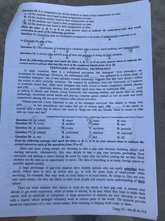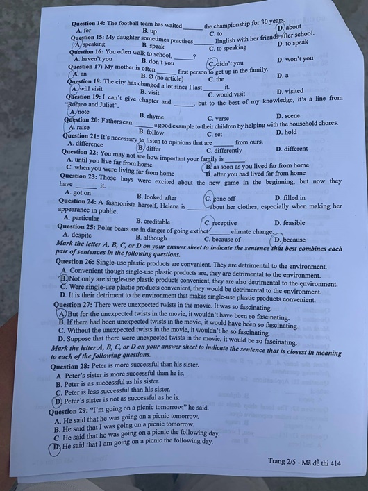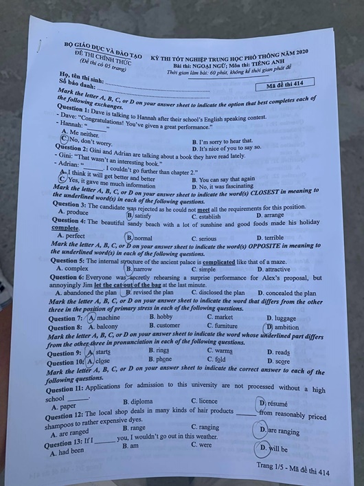 Gợi ý đáp án môn tiếng Anh mã đề 414 tốt nghiệp THPT 2020 chuẩn nhất, chính xác nhất