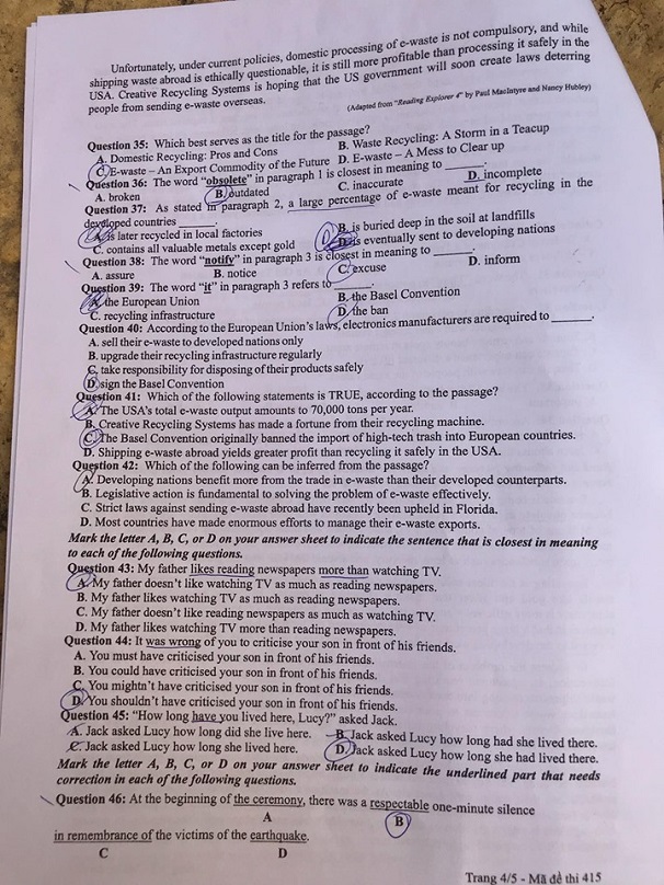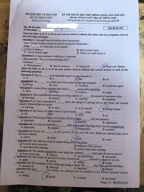 Đề thi môn tiếng Anh mã đề 415 THPT quốc gia 2019 (cập nhật lúc 15h46):