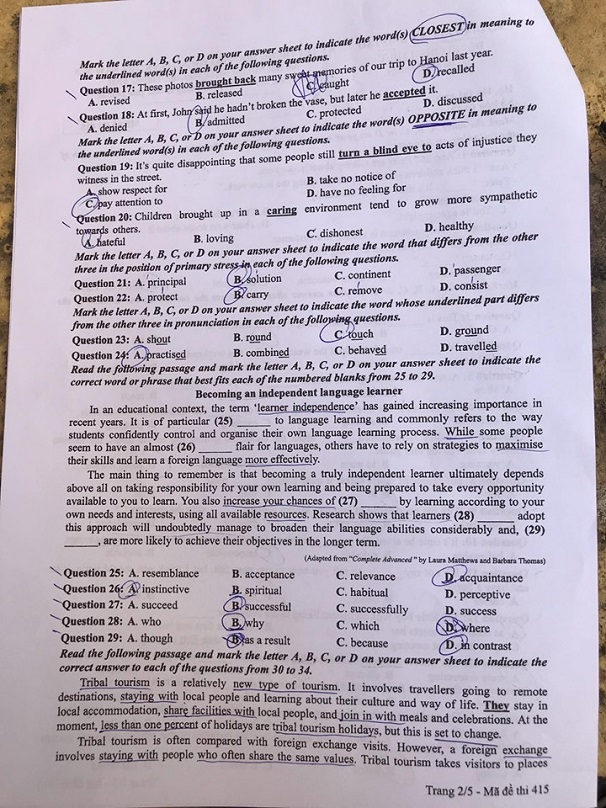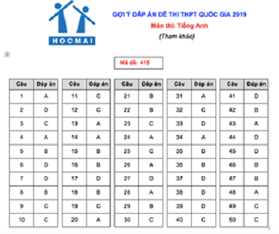 (Ấn F5 để cập nhật đáp án gợi ý môn tiếng Anh mã đề 415 THPT quốc gia 2019 chuẩn nhất )