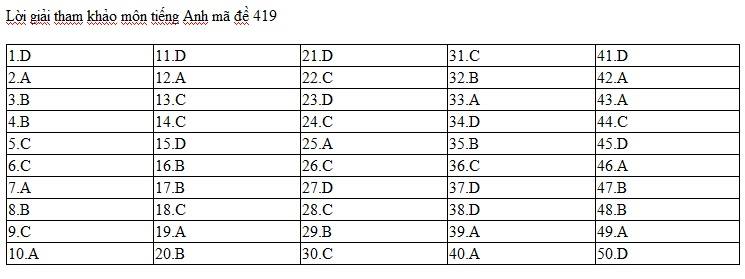 Đáp án đề thi môn Tiếng Anh mã đề 419. Cập nhật đáp án gợi ý môn Tiếng Anh THPT quốc gia năm 2017 trên trang Đời sống & Pháp luật trong khi chờ đáp án chính thức của Bộ GD-ĐT.
