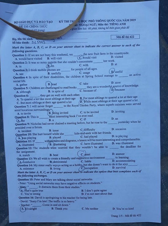 (Ấn F5 để cập nhật đáp án gợi ý môn tiếng Anh mã đề 422 THPT quốc gia 2019 chuẩn nhất )