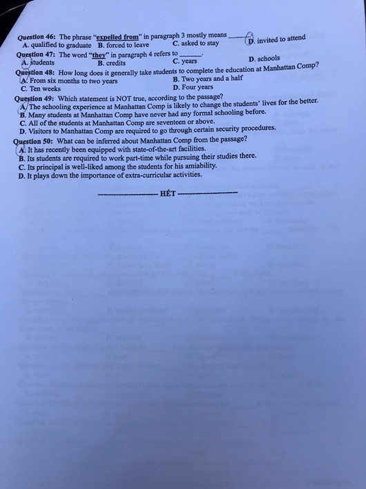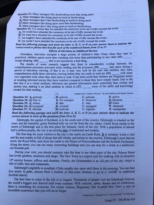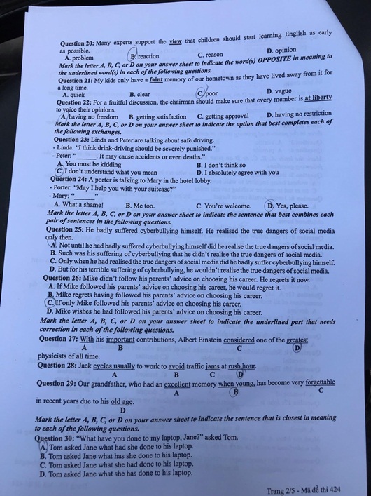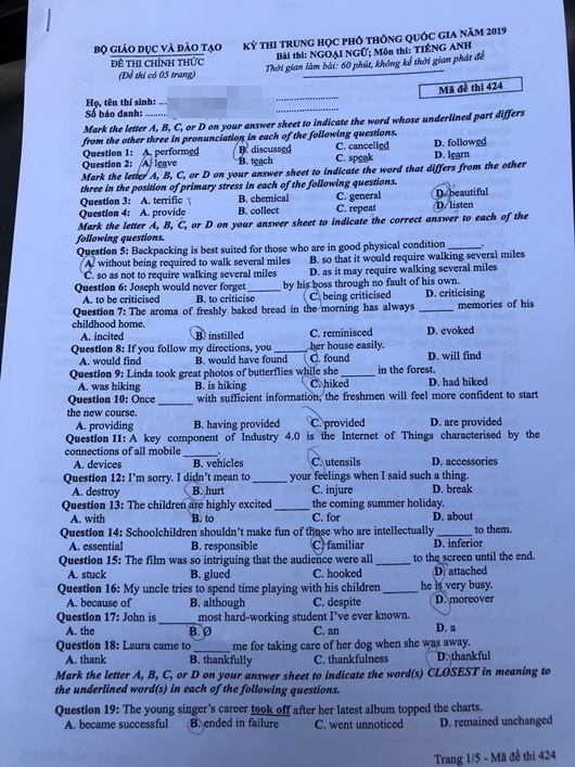 Đề thi môn tiếng Anh THPT quốc gia 2019 mã đề 424 (Đáp án trong bài là của thí sinh dự thi):
