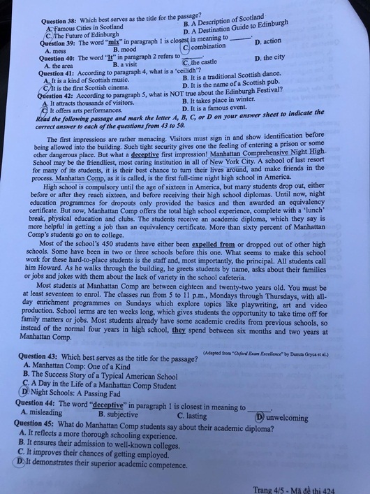 (Ấn F5 để cập nhật đáp án gợi ý môn tiếng Anh mã đề 424 THPT quốc gia 2019 chuẩn nhất )